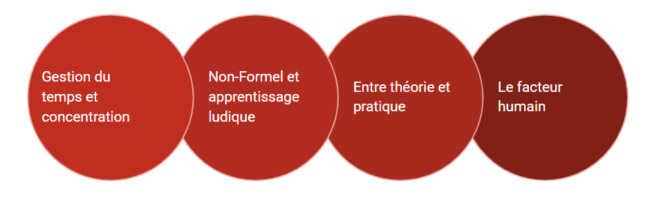 Le troisième point est l’équilibre entre théorie et pratique : un organisme passif n’apprend pas ou peu. La mise en application et les mises en situation permettent de (re)trouver la théorie.